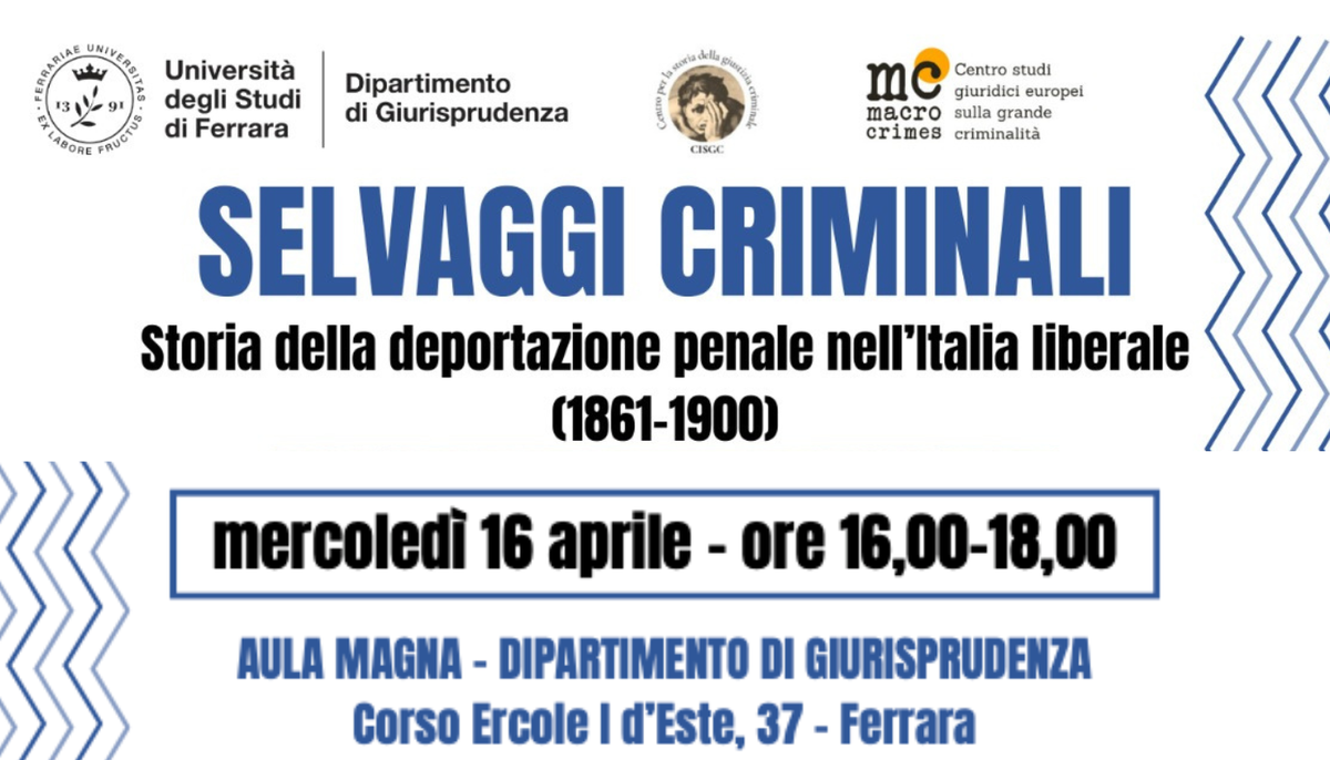 Mercoledi 16 aprile 2025, alle ore 16.00, si terrà presso l'Aula Magna del Dipartimento di Giurisprudenza, il seminario "Selvaggi Criminali. Storia della deportazione penale nell'Italia liberale (1861-1900)".