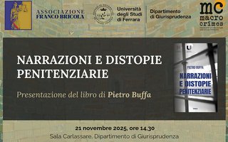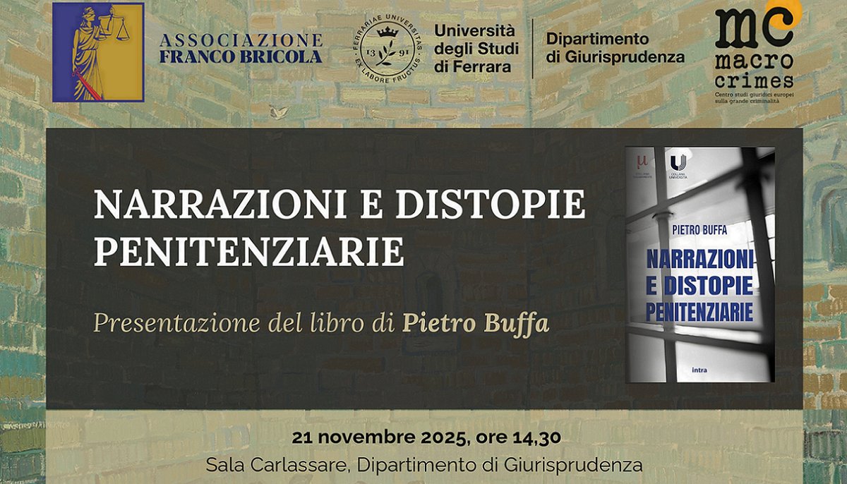 Venerdì 21 novembre 2025, alle ore 14.30, presso la Sala Carlassare del Dipartimento di Giurisprudenza dell'Università di Ferrara, avrà luogo la presentazione del libro "Narrazioni e distopie penitenziarie", di Pietro Buffa, edito da Intra nella collana "Università".