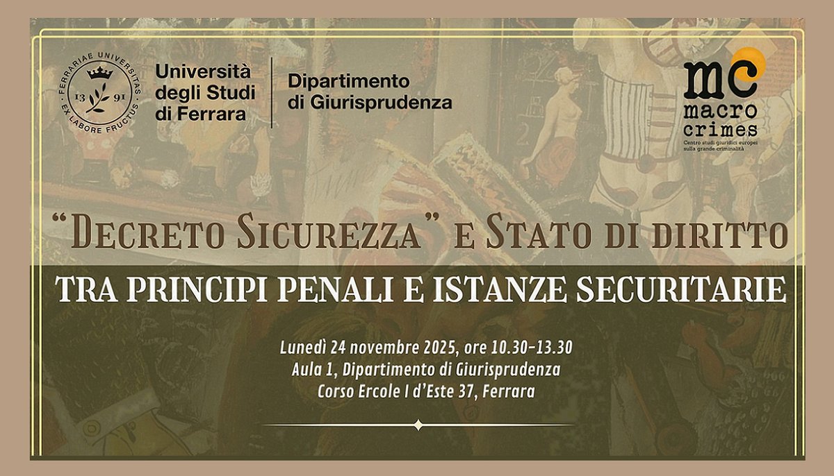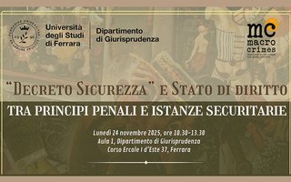 Il 24 novembre 2025, a partire dalle ore 10.30 e fino alle 13.30, si terrà presso l'aula 1 del Dipartimento di Giurisprudenza dell'Università degli Studi di Ferrara il seminario dal titolo "Decreto Sicurezza" e Stato di diritto - tra principi penali e istanze securitarie.