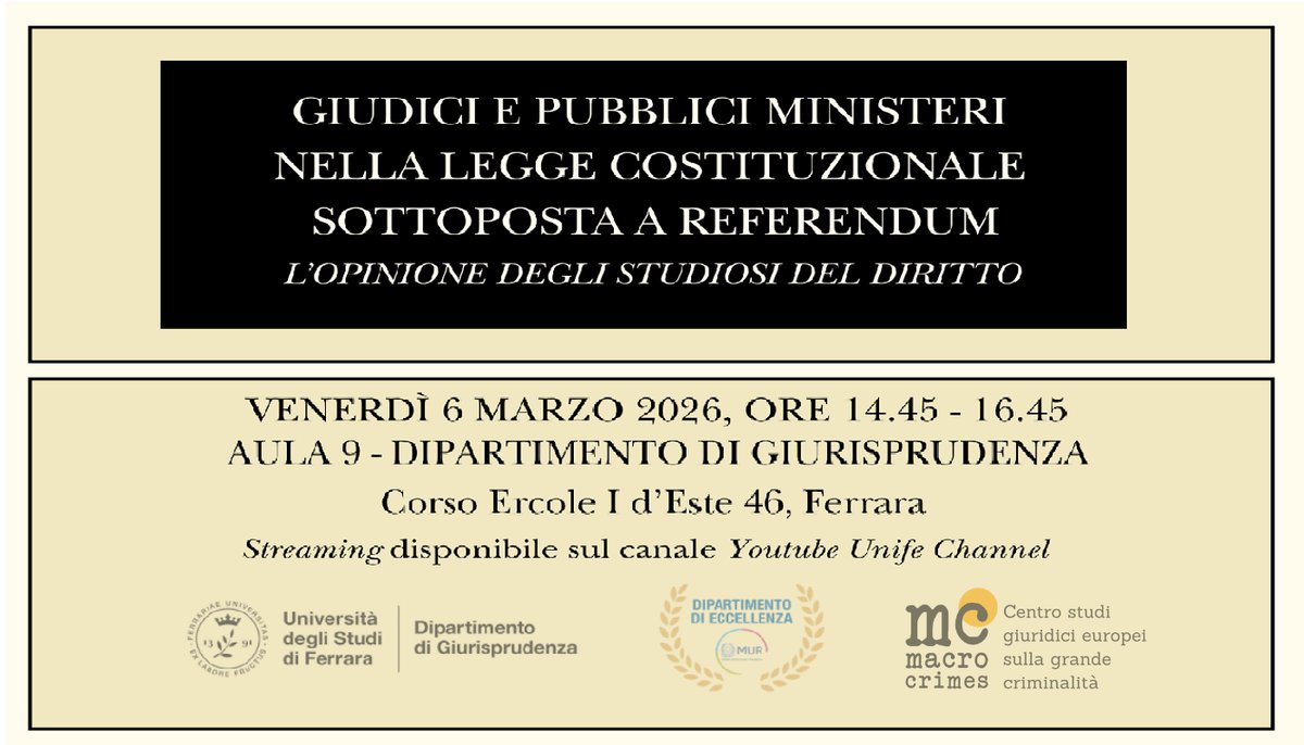 Il 6 marzo 2026, presso l'aula 9 del Dipartimento di Giurisprudenza di Ferrara, a partire dalle ore 14:45, avrà luogo il seminario intitolato "Giudici e Pubblici Ministeri nella legge costituzionale sottoposta a referendum. L'opinione degli studiosi del diritto".