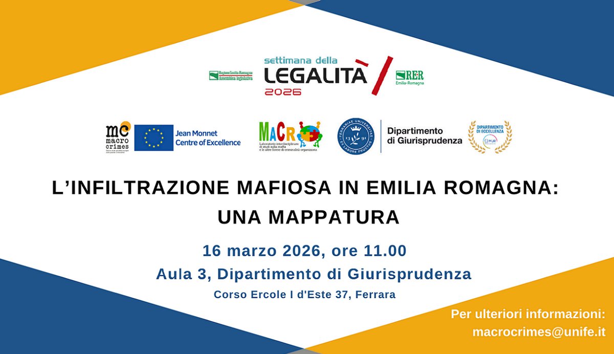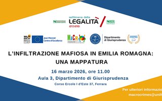 In occasione della Settimana della Legalità 2026 (16-21 marzo), promossa dalla Regione Emilia-Romagna, il Centro Macrocrimes e il Dipartimento di Giurisprudenza di Ferrara organizzano un incontro sul tema "L’infiltrazione mafiosa in Emilia-Romagna: una mappatura", che si terrà il 16 marzo alle ore 11, presso il Dipartimento.